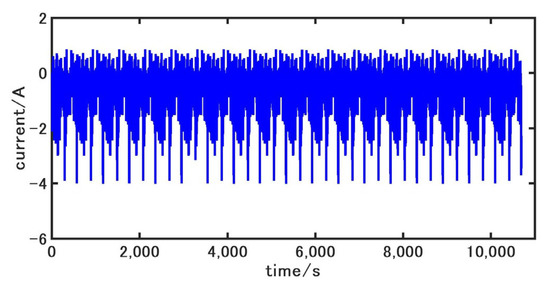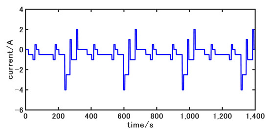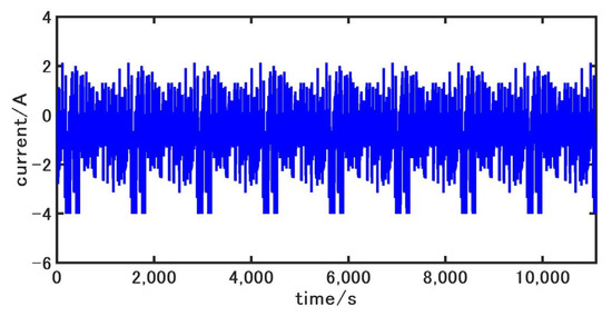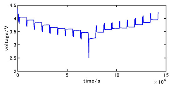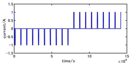 The accuracy of battery model parameters greatly affects the SOC estimation accuracy, so it is necessary to accurately identify the parameters, , , , , and in the battery model. Since the calculational effort of online identification is greater compared to that of offline identification, this paper uses the particle swarm optimization algorithm for offline identification of the model under incremental current conditions. The current and voltage of the incremental current condition are shown in Figure 2 and Figure 3, respectively.