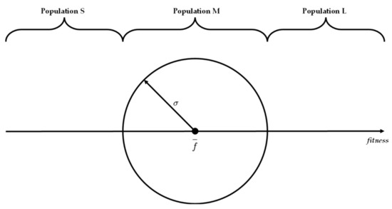 The likelihood function used by the PF algorithm is a normal distribution type, which is prone to excessive differences between particles, then causes degradation of particles, and finally leads to the reduction of the estimation accuracy. For the defects of the PF, this paper uses an improved particle swarm algorithm [31] to optimize the sampling process before the particle filtering update period. Traditional particle swarm algorithm is prone to fall into local optimal solutions in the iterative search process, so this paper makes the following improvements: the particle population is divided into three parts, and different update strategies are used to realize the self-mutation and mutual learning of particles so that the algorithm can jump out of the local optimum, accelerate convergence and improve the estimation accuracy. The size of the fitness value reflects the distance of the particle from the real state. The fitness values of the particle population are sorted from small to large and then divided into three parts according to the mean value and the standard deviation , as shown in Figure 4.