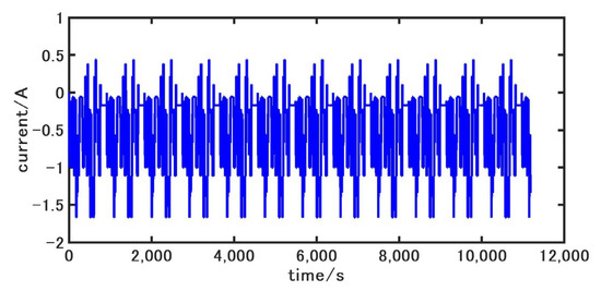 In order to validate the accuracy of the model and the SOC estimation. The Dynamic Street Test (DST), the Federal Urban Driving Schedule (FUDS), the Intense Driving Schedule (US06 Supplemental FTP Driving Schedule, US06), and the Beijing Dynamic Stress Test (BJDST) from the University of Maryland battery data [32] are selected for the experiment. All tests were performed for 80% battery level and 50% battery level at 0 °C, 25 °C and 45 °C. We chose the data that the battery tests were performed for 80% initial SOC at 25 °C as they are the most commonly used data. Firstly, the battery is discharged to 80% SOC, then the battery is discharged according to the four working conditions, and the current and voltage are recorded. The current curves are obtained as shown in Figure 6, Figure 7, Figure 8 and Figure 9. It can be seen that the current fluctuation frequency of the four conditions is high, and the charge/discharge ratio is large, which is relatively close to the actual usage.