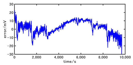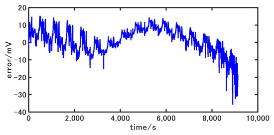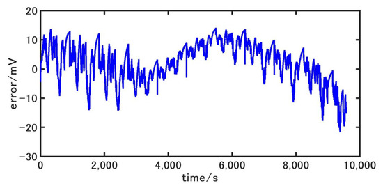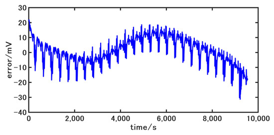 In order to verify the accuracy of the second-order RC model, the four driving condition data are selected for verification. Since electric vehicles that drive under extreme loads during actual driving are relatively rare, the battery data from 80% to 10% SOC are selected for experiments in this paper. The battery is discharged according to the current shown in Figure 6 and Figure 7, and the terminal voltage and SOC of the battery are recorded. The above currents are used to simulate the model, and the terminal voltage of the battery model is obtained. The error curves of the model terminal voltage are shown in Figure 11, Figure 12, Figure 13 and Figure 14. As can be seen, the errors of the voltage of the battery model are controlled within 20 mV overall, and the fluctuation range is small. The maximum errors are only 34.4 mV, 29.9 mV, 35.7 mV, and 21.6 mV, respectively, which shows that the second-order RC equivalent circuit model built in this paper has high accuracy and can well reflect the dynamic working characteristics of the battery.