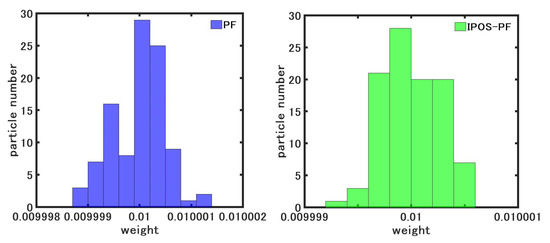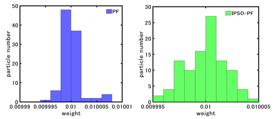 Theoretically, the computational complexity of the IPSO-PF algorithm increases compared to the PF algorithm due to the inclusion of the PSO algorithm, but it is not much different from that of the PSO-PF algorithm. We ran all the algorithms on the MATLAB 2016b platform of an AMD I7-6500U processor with 3.20 GHz and 16 GB memory and calculated the computational complexity. The EKF, PF, PSO-PF, and IPSO-PF algorithms take 0.89 s, 6.32 s, 8.16 s, and 8.73 s, respectively. Although the EKF algorithm has the lowest complexity, it has poor estimation accuracy in non-Gaussian scenarios. The complexity of the proposed algorithm is almost the same as that of the PSO-PF algorithm and slightly inferior to the PF algorithm, but with a significant improvement in accuracy. Therefore, it further demonstrates the superiority of the IPSO-PF algorithm.