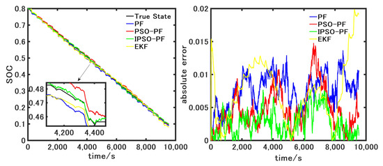 In order to verify the superiority of the algorithm proposed in this paper, the algorithm is verified using the DST driving condition, and the experimental results are shown in Figure 15, Figure 16 and Figure 17. As can be seen from Figure 15 and Figure 16, the difference in particle weights of the PF algorithm is big, and the number of particles with large weights is gradually reduced while the particles with small weights are gradually degraded. Therefore, the sets of particles will gradually deviate from the true state and eventually leads to a decrease in the estimation accuracy. In contrast, the particle weights of the IPSO-PF algorithm have smaller differences and are more uniformly distributed, which can effectively guarantee the diversity of particles and prevent particle degradation, thus improving the estimation accuracy. It can be further illustrated by Figure 17 that the SOC estimation results of the IPSO-PF algorithm are closer to the true value. The EKF algorithm has the worst performance, and it gradually diverges at the end of the estimation phase, resulting in a maximum error approaching 2%. The estimation error of the PF algorithm dissipates with the increase of time, and the maximum error of the PSO-PF algorithm is too large due to the population falling into the local optimal solution, while the IPSO-PF algorithm controls the error within a certain range.