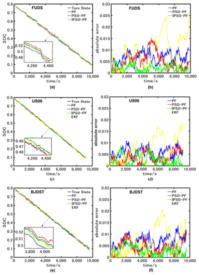 In order to verify the generalizability of the proposed algorithm under different driving conditions, the FUDS, US06, and BJDST data are used for SOC estimation, and then compare the estimation results with the PF and PSO-PF algorithm. The experimental results and errors are shown in Figure 18. As is shown in Figure 18a,c,e, the PF algorithm, the PSO-PF algorithm, and the IPSO-PF algorithm can effectively estimate the SOC, and the estimation results of the IPSO-PF algorithm are closer to the true value. It can be seen from Figure 18b,d,f that the estimation errors of the IPSO-PF algorithm are significantly lower and fluctuate less under different driving conditions compared with the EKF, PF, and PSO-PF algorithms. The three error evaluation indexes are shown in Table 5, Table 6 and Table 7. According to the results, the ME of the IPSO-PF algorithm is limited to 0.9%, and the MAE is limited to 0.28%, which is less than the ME and MAE of the PF algorithm and the PSO-PF algorithm. The experimental results show that the proposed algorithm effectively solves the problem of estimation error increase due to particle degradation and has good estimation performance. The RMSEs of the IPSO-PF algorithm in FUDS, US06, and BJDST conditions are 0.25%, 0.34%, and 0.33%, respectively, which are at least 55% lower than those of the EKF algorithm, 45% lower than those of the PF algorithm and 22% lower than those of the PSO-PF algorithm, effectively improving the estimation accuracy of the SOC, indicating that the IPSO-PF algorithm has good generalizability and superiority.