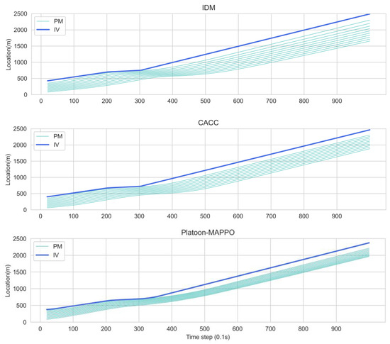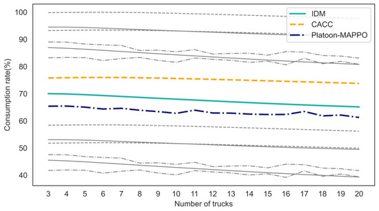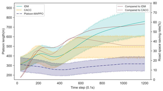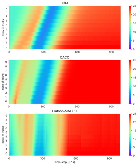 - Action: the main application scenario of truck platoon control technology is on highways, where the traffic environment is relatively simple. To minimize the interference of truck platoons with other human drivers, truck platoons will travel on the rightmost lane. Therefore, this article focuses on the longitudinal control of truck platoons. After obtaining the observation values, the decision-making algorithms will determine the driving force for each truck at each time step. The driving force indicates the acceleration or deceleration of the truck. When the driving force is positive, it means that the truck accelerates forward and is bounded by the maximum driving force value. When the driving force is negative, it means that the truck decelerates.