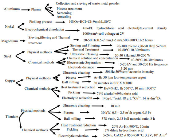 The recycling process typically begins with collecting waste metal powders generated during manufacturing processes, such as additive manufacturing, metal injection molding, and powder metallurgy. These powders are then sorted by composition and properties using techniques like magnetic separation, air classification, and sieving. Once sorted, they undergo further processing, including decontamination, size reduction, and consolidation, to enable their reuse [3].
