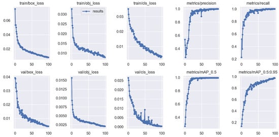 Figure 7 and Figure 8 are a graph of the confusion matrix and the training accuracy loss function. It can be seen in Figure 8 that the losses for train/box, train/obj, train/cls, val/box, val/obj, and val/cls show a significant initial decrease with increasing training iterations, eventually stabilizing. Remarkably, these losses approach 0 after 100 training sessions. Additionally, metrics such as precision, recall, and mAP progressively improve with the number of sessions, converging towards 1 at 100 sessions. These outcomes validate our choice of 100 training sessions as it led to high-accuracy training results.