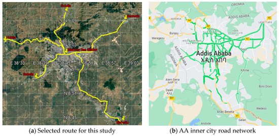 Almost all previous studies on the synthesis of BEV DCs have been based on data from road conditions in developed countries, with only a few contributions from developing countries such as India [22]. Very few studies [26], such as on Addis Ababa (AA), Ethiopian urban DCs, and [13] DCs for Egypt, have developed representative DCs for low-income countries, focusing on emission rates and fuel consumption estimation. However, as concluded by [17,18], these DCs could not be replicable for BEV evaluation and certification. Furthermore, in the development process of these cycles, the study area covered was only the urban territory, with no consideration given to the influence of suburbs on the inner city driving pattern and trip duration. In most capital cities of low-income countries such as AA, the driving pattern is influenced by roads’ mixed-use by pedestrians and different vehicles, single-lane vehicle composition, poor road quality and the absence of traffic signals [4,22]. As Ethiopia’s capital and the seat of the African Union (AU), AA is characterised by a comprehensive economic, political, cultural, and diplomatic environment, with varying topography, population dynamics, and highly congested traffic conditions. AA is a highly populated city with more than 5.23 million residents, and it is growing at a rate of 4.4% annually. The city has a total of around 630,000 registered vehicles, and the count along a single-lane asphalt road is 168 vehicles per kilometre [26]. AA is surrounded by small towns such as Bishoftu (east), Sandafa (north), Sululta (northwest), Holeta (west), and Sebeta (south), with 60 km of suburban routes from the city centre along cross-country main roads. Public transportation using city buses is preferred by most low-income people and extends to the five towns as destinations, starting from the central station (stadium), operating daily from 5.00 a.m. to 9.00 p.m. Furthermore, passenger cars are the preferred means of transport by those in the middle-income class living in AA and looking for low-cost accommodation in neighbouring towns [10].