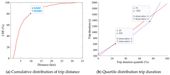 The analysis of trip distances is shown in Figure 4a and recorded an average value of 7.28 km, with the highest frequency in the range of 3–4.5 km. Furthermore, 80% of the trip distances covered less than 9.83 km in CDF. It should be noted that the driven distance of a candidate DC was found to be in a range of 4 km to 15 km but must be near the established CDF value. Regarding trip duration, 25% recorded the highest frequency with a duration of about 750 s (12.5 min). Additionally, the third quartile, as indicated in Figure 4b, was located at 1358 s (22.63 min). Hence, the representative driving cycle should be close to the third quartile, while the duration was adjusted to 1320 s (22 min) to minimise the computational burden.
