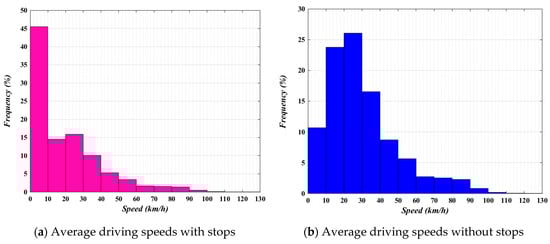 A significant difference of 46% was noted between the average speeds (w/o stop) and average driving speeds (w/stop) in the low-speed phase compared with 8% in the high-speed phase, as shown in Figure 5a,b. This indicates that the influence of stop time on average vehicle speed was based on the percentage of stop time.