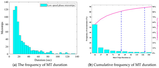 After analysing the CFD of all ten (10) short trips in the low-speed phase, it was found that more than 80% primarily coincided with 64 s (see Figure 6b) heighted in blue (left), and a high frequency (55%) occurred below 20 s (see Figure 6a,b). Hence, the fifth MT, with an average speed of 18 km/h and lasting 64 s, was found to be the best fit with real data and was selected to be the first MT of the low-speed phase. A stop duration between MTs would be steady sampling, and to address the smooth transition, it was decided that the average stop duration of the trip cycle would be 11 s.
