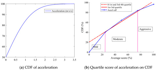 Different CDFs for positive and negative acceleration features were obtained, as shown in Figure 8a, and driving behaviours were identified by dividing the average position of each MT on the CDF graph of the 0–1st quartile, 1st–3rd quartile, and 3rd–4th quartile.