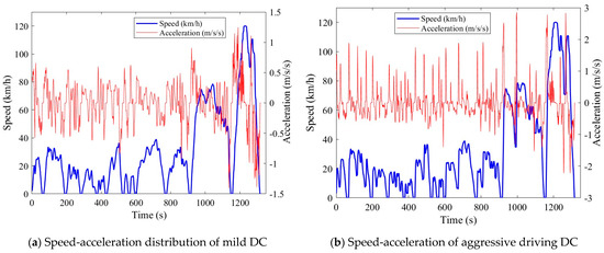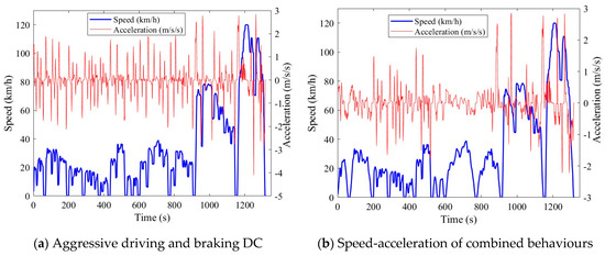 As DC is a second-by-second speed and time profile that represents typical real-time driving patterns in a particular urban area and region, its characteristics differ between regions and cities. Such a driving pattern can be influenced by an individual’s driving behaviour and the interaction with the road traffic environment. However, driving behaviour information cannot be measured directly using driving profile parameters. Various methodologies have been presented to determine driving behaviour based on driving data. Author [7] used naturalistic driving data to identify driving style; refs. [8,9] presented different classifications of driving behaviour, such as aggressive, average, and mild. Some previous studies demonstrated the existence of a high correlation between the driving style, the acceleration, and the velocity of a cycle by introducing the possibility of a percentage of aggressiveness. Many studies have confirmed that aggressive driving styles record higher values of energy consumption than drivers driving calmly do. However, in most studied regional BEV DCs, the driving pattern has been characterised by focusing on the acceleration behaviour only and ignoring the braking behaviour [10,11]. Other studies have indicated the presence of significant differences in braking power intensity between aggressive and coast braking [12,13].