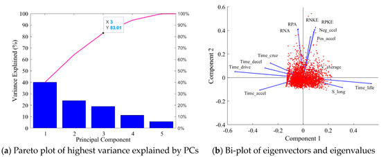 The two-dimensional bi-plot presented in Figure 11b shows the contribution and influence of the driving features on the first two PCs. The highest variability was found in speed-related features, distance, and time percentage of the stop because they were the main contributors to the variance explained by the first PC. Acceleration-related features, including APA, ANA, RPA, RNA, PKE, and NKE, mainly influenced the second component. The third component was mainly affected by the stop and time proportion of each kinematic mode.