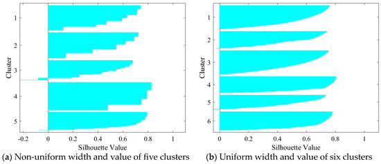 The three PCs were grouped by k-means into the optimum number of six clusters, as shown in Figure 12b with the higher silhouette value of 0.78, and uniform width obtained when compared with the 0.74 silhouette values and non-uniform widths of five clusters shown in Figure 12a. Short trips were then selected from all the clusters based on their closeness to the cluster centres until a total duration of 1320 s was obtained.