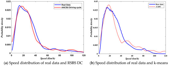 Relative, mean relative, and root mean square errors of speed and acceleration-related features between candidate DCs and the entire dataset were calculated. The difference between the speed distributions of the real data from DCs by the RSBS and k-means methods were compared and are shown in Figure 13a,b, respectively.