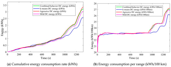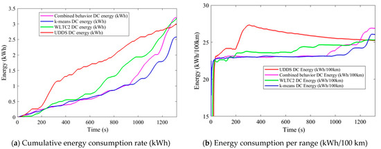 The cumulative energy consumption rate and consumption per 100 km by RSBS, k-means, WLTC-2, and UDDS DC were calculated, and the results are shown in Figure 16a,b. Less energy was consumed by RSBS DC than by the WLTC-2 and UDDS cycles at a wide operating range, except at peak velocity.