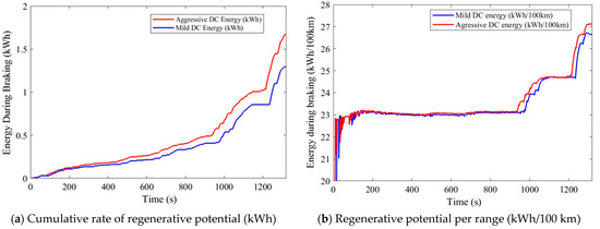 Figure 15a,b shows a comparison of the effect of braking behaviour division on regenerative potential with coast and panic braking. More braking kinetic energy of 1.65 kWh (21.2%) was wasted by aggressive drivers than the 1.3 kWh wasted by coast drivers. Studies have indicated that the regeneration potential with current advances was only 8% of energy for aggressive drivers and up to 25% for coast drivers [34].