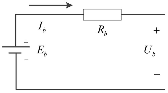 At present, the equivalent circuit model is usually used to model the lithium battery, and we adopt the internal resistance model as the equivalent circuit model. Although the model cannot reflect the dynamic characteristics of the battery accurately, it can reflect the energy consumption realistically, quickly and in a way that is easily understandable. Its circuit principle is shown in Figure 3: