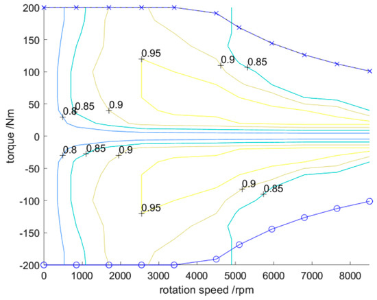 The MAP diagram of the engine is shown in Figure 4. We can know the distribution of their efficiency curves when the motor is used as an electric motor and generator. At the same time, it is also possible to obtain the values of the parameters of the motor; for example, we can know that its maximum motor torque is 200 , the maximum speed is about 8500 and the rated speed is about 4500 .