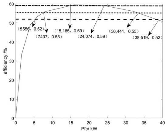 As can be seen in Figure 2, the fuel cell operates at its highest efficiency, close to 60%, when its output is about 23 kW. In the 5–40 kW range, the operating efficiency remains above 50 percent. However, if the output power of the fuel cell is too low or too high, the output efficiency of PEMFC will decrease, leading to an increase in hydrogen consumption, which is not conducive to improving the overall vehicle economy and may damage the performance of the fuel cell. To reduce the hydrogen consumption of the fuel cell and improve fuel economy, the power output of the fuel cell should be kept within the efficient operating range as far as possible.