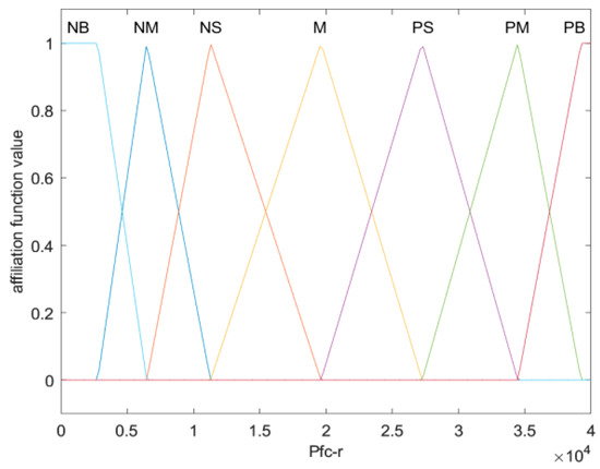 Formulation of the membership function for the input variable : from the three horizontal lines corresponding to the efficiencies of 0.52, 0.55, and 0.59, the efficiency curve of the 40 fuel cell is divided into seven intervals, and the midpoint of each interval segment corresponds to the value of the membership function of 1. The divisions of the operating intervals and the membership functions of the input variables are shown in Table 4 and Figure 6, Figure 7, Figure 8 and Figure 9.