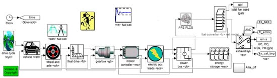 MATLAB R2014b was used to complete the simulation verification of the whole-vehicle energy management. The fuzzy controller for the EMS was designed using the fuzzy logic toolbox as shown in Figure 11. Through the secondary development of Advisor 2002 software, we were able to complete the construction of the FCHEV model [30], and each module in the model represented different components of the vehicle. The transfer of information between modules was indicated by arrows. We obtained the power demand of the whole vehicle according to the cycle condition and the energy flow passes through the vehicle, wheels, main gearbox, transmission, engine and bus module in order; finally, the power required by the bus was distributed by the fuel cell and lithium battery together. The whole-vehicle simulation experiment was completed, and the whole-vehicle performance, fuel cell performance degradation and whole-vehicle economy were analysed. The simulation model of the FCHEVs and the meaning of each module are shown in Figure 13 and Table 6.