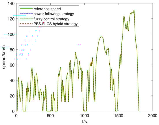 The WLTC cycle conditions are divided into four simulation conditions: low speed, medium speed, high speed and ultra-high speed, with no periodic acceleration and deceleration, large speed fluctuations and little idling, which better reflect the real driving scenarios that are sometimes fast and sometimes slow; the four conditions are selected as the simulation conditions. Figure 14 shows that the PFS-FLCS hybrid control strategy proposed in this paper, as well as the PFS and the FLCS, are able to achieve speed following for the WLTC cycle condition, and all of them are able to meet the performance index of the whole vehicle.