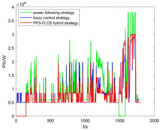The simulation results of the fuel cell output power under the PFS-FLCS hybrid control strategy, the FLCS and the PFS are shown below.