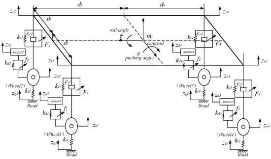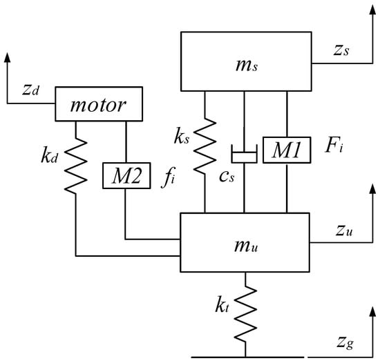 Establishing a reasonable system of the dynamics model of vehicle suspension is essential for the design and performance analysis of active suspension systems and for studying energy-feedback characteristics [23]. As shown in Figure 1, this paper selects the suspension structure type of the in-wheel motor mounted on the wheel [6]. The main suspension is between the upper spring and the wheel, and the secondary suspension is between the wheel and the in-wheel motor unit. A schematic diagram of the vehicle suspension dynamics model is established, as shown in Figure 2, and the vehicle model parameters are shown in Table 1. According to Newton’s second law, the dynamic equation of the active energy-regenerative suspension of the electric vehicle driven by the in-wheel motor is as follows: