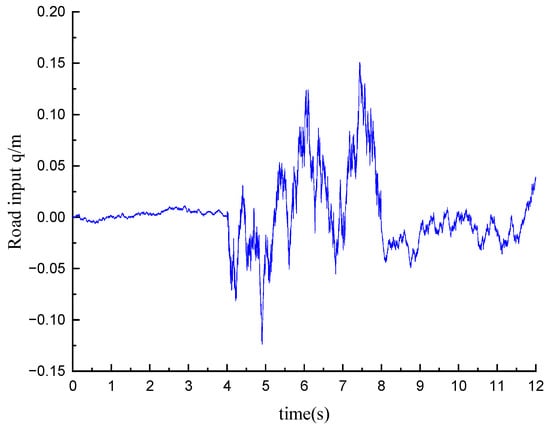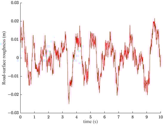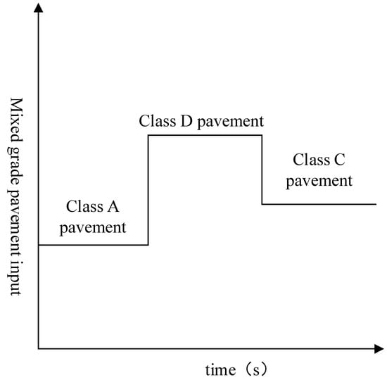 Based on the method of trigonometric series, a random road spectrum including ISO-A, D, C is established, in which the speed of A grade road is 25 m/s, that of D grade road is 5 m/s, and that of C grade road is 10 m/s; thus, the journey time for each segment is 4 s, as shown in Figure 7.