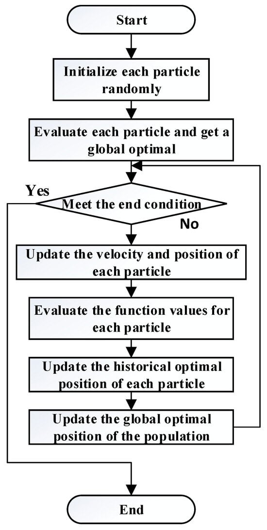 where Vk+1id is the d-dimensional component of the flight velocity vector of the ith particle in the k + 1 iteration, Vkid is the d-dimensional component of the position vector of the ith particle in the kth iteration, c1, c2 are the numbers of the accelerated constant, r1, r2 are two random functions, ω is the inertia weight, Xkid is the position of the kth particle, Xk+1id is the position of the k + 1st particle, Pkid is the dth dimension of the individual extreme value of i variable in the kth iteration, and Pkgd is the dth dimension of the global optimal solution of the kth iteration. The flow chart of the particle swarm optimization algorithm is shown in Figure 9.