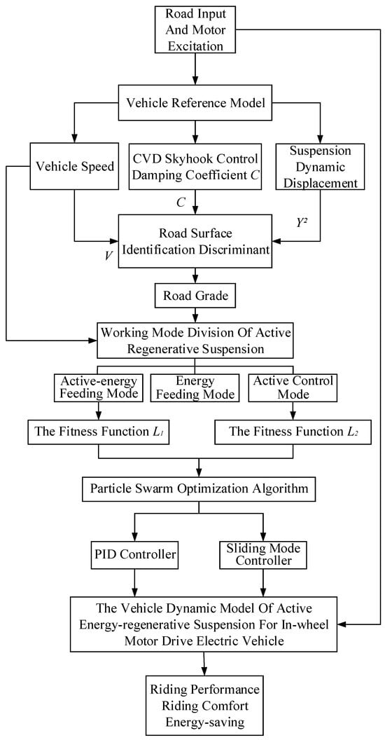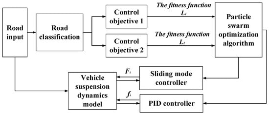Section 3 and Section 4 use the structural characteristics of the suspension itself to set and optimize the sliding mode controller and the PID controller at the main suspension and the secondary suspension, respectively. This improves the vertical vibration suppression effect of the suspension on the body and the motor and plays a positive role in solving the coupling effect between the two. Compared with previous studies, and comparing with Reference [13], on the basis of sliding mode control, not only the vertical vibration of the body is considered, but also the vertical vibration and unbalanced excitation of the hub motor are taken into account. At the same time, the change of the road level leads to the switching of the suspension mode. Compared with the particle swarm optimization method proposed in reference [16], this paper has more optimization objectives, and uses a more robust sliding mode controller on the spring, which can improve the ride comfort and safety of the vehicle on different roads. As shown in Figure 12, this is a block diagram of the vehicle control strategy for this article.