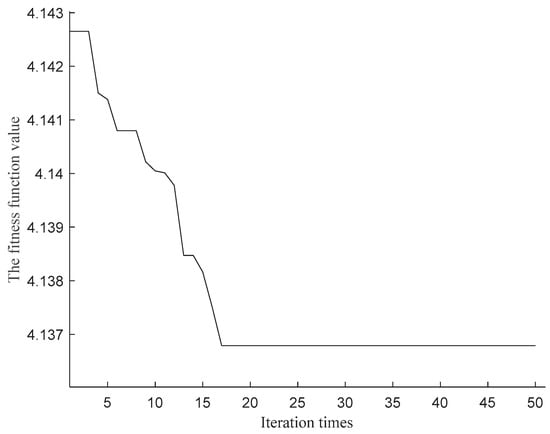 The IWM-EV vehicle active regenerative suspension Simulink model is simulated by the particle swarm optimization algorithm, and the sliding mode controller parameters cz, cx, cy, and PID controller parameters Kp, Ki, and Kd are optimized by particle swarm optimization. Shown in Figure 11 is the function value convergence curve of the objective function L1 under the A-level road speed of 25 m/s, etc. Under other road grades and vehicle speeds, the optimization results are shown in Table 6.