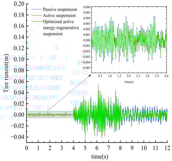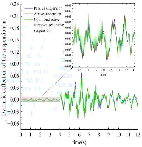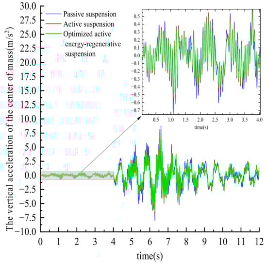 In 0~4 s, the active energy-regenerative suspension is in the active control mode. In 4~8 s, the active energy-regenerative suspension is in the active energy-regenerative mode. In 8~12 s, the active energy-regenerative suspension is in the active control mode. According to the simulation results in the above three time periods, it can be concluded from Figure 14, Figure 15, Figure 16, Figure 17, Figure 18, Figure 19 and Figure 20 and Table 1, Table 2 and Table 3 that for the root mean square value of the vertical acceleration of the center of mass, the active suspension is reduced by 14.1%, 1.4%, and 15.4%, respectively, compared with the passive suspension; compared with the active suspension, the optimized active regenerative suspension decreased by 6.8%, 5.1%, and 24.8%, respectively. For the root mean square value of the dynamic deflection of the suspension, the active suspension is reduced by 15.4%, 10.9%, and 4.3%, respectively, compared with the passive suspension; compared with the active suspension, the optimized active regenerative suspension decreased by 27.2%, 10.2%, and 15.9%, respectively. For the root mean square value of tire runout, the active suspension decreased by 16.7%, 2.6%, and 11.1%, respectively, compared with the passive suspension; after optimization, the active energy-regenerative suspension is reduced by 30%, 9.9%, and 21.4%, respectively, compared with the active suspension. From the changes of the above three indexes it can be seen that the active energy-regenerative suspension based on the control strategy of this paper can improve the vertical vibration effect of the vehicle body on the mixed grade road surface and improve the ride comfort of the in-wheel motor drive electric vehicle compared with the active suspension and the passive suspension.