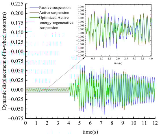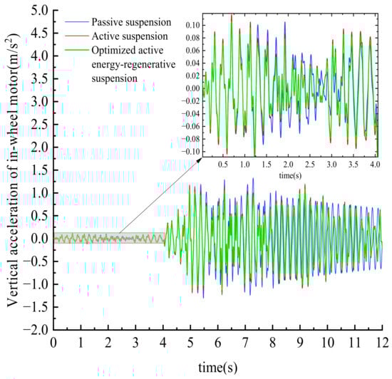 For the root mean square value of the dynamic displacement of the hub motor, the active suspension is reduced by 17.2%, 7.1%, and 5.8%, respectively, compared with the passive suspension, and the optimized active regenerative suspension is reduced by 12.5%, 19.3%, and 10.2%, respectively, compared with the active suspension; For the root mean square value of the vertical acceleration of the in-wheel motor, the active suspension is reduced by 22.8%, 12.5%, and 15.4%, respectively, compared with the passive suspension, and the optimized active regenerative suspension is reduced by 5.9%, 6.5%, and 20.2% compared with the active suspension. It can be seen from the two indicators of the hub motor that the vertical vibration of the hub motor is suppressed during the driving process of the vehicle, thus providing a good solution for the coupling characteristics of the pulse on the side of the hub motor and the side of the body.