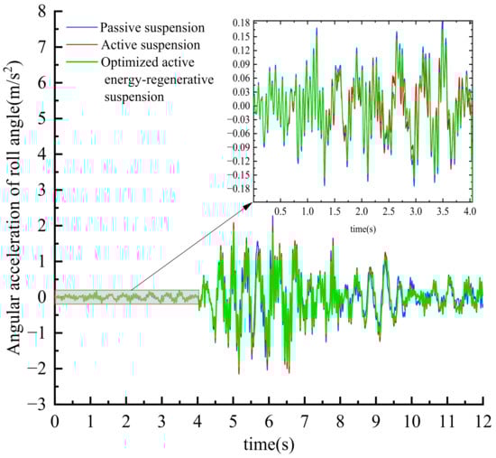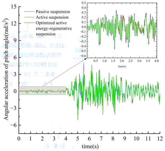 Similarly, for the root mean square value of roll angle acceleration, the active suspension is reduced by 28%, 23.4%, and 4.04%, respectively, compared with the passive suspension, and the optimized active regenerative suspension is reduced by 27.7%, 24.8%, and 7.4%, respectively, compared with the active suspension; for the root mean square value of pitch angle acceleration, the active suspension is reduced by 43%, 4.3%, and 4.04%, respectively, compared with the passive suspension. Compared with the active suspension, the optimized active regenerative suspension is reduced by 16.6%, 8.3%, and 21.4%, respectively. The changes in these two indicators show that the vehicle’s driving safety has been dramatically improved, especially in poor road conditions; the reduction of pitch angle and roll angle acceleration dramatically reduces the risk of vehicle slip and sideslip or rollover.