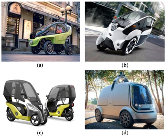 Two academic studies explored the possibility of offering safe and comfortable L5e-category vehicles for one or two passengers. The studies included prototype building and simulations. A consortium, working under Project RESOLVE [13], within the framework of Horizon 2020 GV-2014, addressed many of the concepts and technological issues. The other study is Project Hagar [14] under the aegis of Afeka Academic College, led by the first author of this paper. Both projects worked with similar concepts and reached similar conclusions. Concept previews are shown in Figure 4.