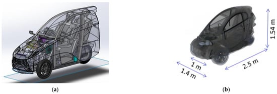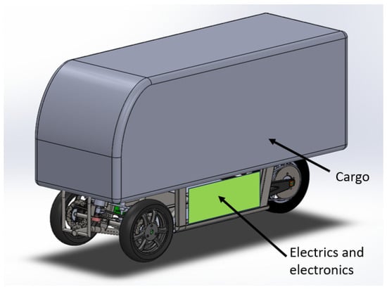 As shown in Figure 5, the vehicle has three wheels, with a single wheel at the rear of the vehicle. The rear wheel is driven by an electric motor. There are two front wheels that can be steered sideways. The front wheels are suspended on a mechanism that allows the vehicle to tilt about a virtual axis on the road surface, which is parallel to the vehicle’s longitudinal axis (direction X). Such a mechanism is common in three-wheeled motorcycles and motorscooters, and can be found, for example, on the Piaggio MP3 [32] and the Yamaha Tricity [33]. The central area between the wheels is designated to house the traction battery, power electronics, AI computing hardware, and HVAC systems. The cargo deck is positioned above the wheels, leaving a free space above the wheels to accommodate suspension travel.