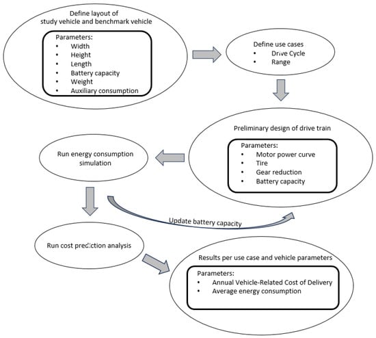 The objective of this methodology is to establish a workflow aimed at determining optimal vehicle parameters that will result in optimal performance from the perspective of the vehicle operator. For the operator, the most important performance metric is the delivery cost of a package throughout the lifecycle of the vehicle. The cost of package delivery must be defined in a manner that makes it possible to compare different types of vehicles with different cargo capacity and along different driving routes, as presented in a previous work [34] by the first author of this paper. The first goal in the parameter optimization process is to minimize the annual vehicle-related cost of delivery (AVRCoD). To enable meaningful comparisons, we normalize the annual total cost of ownership (TCO) in euro currency by the total weight of packages that can be delivered, and the number of kilometers related to the use case of the vehicle. The AVRCoD is measured in EUR/year × kg × km, as explained in more detail below. The second goal is to minimize the vehicle’s average energy consumption, measured in Wh/km. The optimized solution often depends on the specific use case of the vehicle. We defined several use cases to allow examination of the most relevant cases for a metropolitan delivery service.