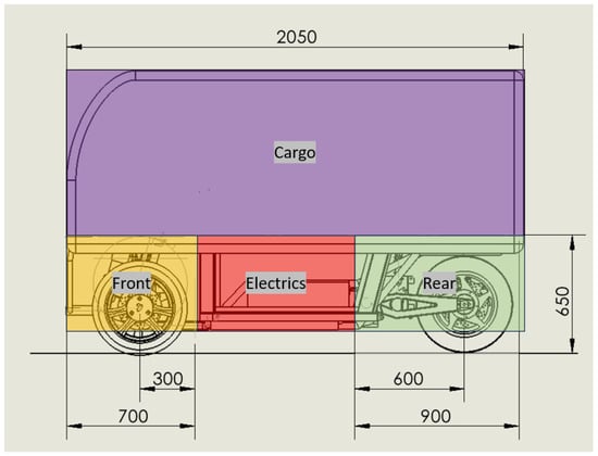 The vehicle layout is based on an L5e three-wheeled motorcycle with a cargo compartment instead of space for a rider, as explained above. The layout of the vehicle is governed mainly by its packaging requirements. The vehicle is divided into four clusters based on their functionality. Figure 7 shows this cluster approach implemented on the proposed vehicle. The clusters are divided into fixed and modular clusters. The fixed clusters are the front and rear areas. The front cluster comprises the wheels, suspension, steering mechanism, and brakes, along with the free volume needed to allow the wheels to move up and down, and to allow steering motion. The dimensions of the front and rear cluster were set based on the dimensions of the tires that are suitable for the speed and loads exerted on them. The free volume needed for wheel motion and the horizontal dimensions are based on common three-wheel motorscooters such as the Piaggio MP3 and the Aeon Quadra. The dimensions used in this research are initial figures that serve the purpose of making conceptual design decisions. Engineers and decision-makers will most likely alter these figures in a detailed design phase that follows the conceptual stage.