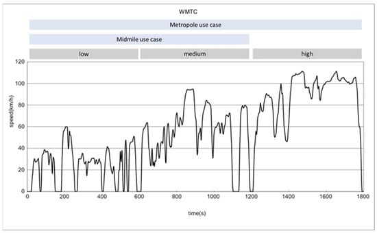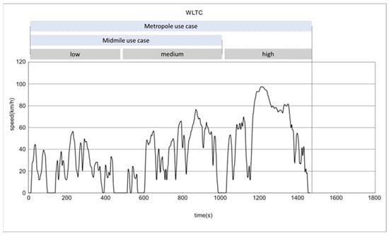 Since the proposed concept is examined in reference to traditional four-wheeled vehicles, we used the WLTC (Worldwide Harmonized Light Vehicles Test Cycle) [38]. The WLTC is the equivalent regulatory drive cycle used for N1 and M1 vehicle energy consumption and emissions tests, corresponding to the WMTC. The WLTC has a slower pace, lower magnitude of accelerations, and more stoppage time. We used the same method of combining low- and medium-speed parts for the midmile use case, and low-, medium-, and high-speed parts for the metropole use case. Both the WMTC and WLTC drive cycles have ultrahigh-speed parts that were omitted for the purpose of this study. Table 2 and Figure 8 and Figure 9 show the characteristics of the drive cycles and the way they were used to define the use cases.