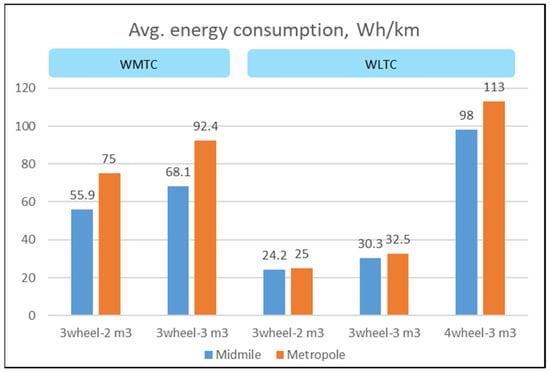 In this section, we present simulation results, comparing a three-wheeled narrow-track vehicle with cargo volumes of 2 and 3 m3, and a four-wheeled double-track vehicle with the same cargo volumes. The results are organized according to the following variables: energy consumption, total cost of delivery, and relative contribution to annual cost. The comparison is made between the two studied use cases, midmile and metropole, defined by the driving cycle, daily travel range, and available cargo capacity. A detailed description of the use cases is given in the Section 3.