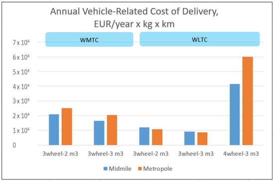 The double-track vehicle showed the highest delivery costs: 4.14 × 10−4 EUR/year × kg* × km for the midmile use case and 6.01 × 10−4 EUR/year × kg* × km for the metropole use case. In Table 6, both values are assumed to be 100% relative to the narrow-track vehicle results. The narrow-track vehicle with a cargo capacity of 3 m3 achieved the lowest delivery cost values in the midmile use case: 9.25 × 10−5 EUR/year × kg* × km. In the metropole use case, using the WLTC, the costs were 8.75 × 10−5 EUR/year × kg* × km. In general, slightly higher values were achieved by the narrow-track vehicle when following the WMTC. There was also a greater difference in the resulting values when comparing the midmile and metropole use cases. The percentages for the 2 m3 vehicle were 50% for midmile and 42% for metropole; for the 3 m3 vehicle, they were 40% for midmile and 34% for metropole, compared to the double-track vehicle. All results are shown in Table 6 and Figure 11.