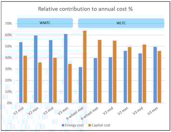 Figure 11 illustrates an interesting phenomenon. The AVRCoD for the metropole use case is higher under the WMTC than the AVRCoD for the midmile use case, whereas it is smaller for the WLTC drive cycle. Moreover, in the case of the double-track vehicle with the WLTC drive cycle, the AVRCoD on the metropole use case is higher. An examination of the breakdown of the AVRCoD calculation explains these results. It is evident from Figure 12 that energy cost is the predominant factor when driving according to the WMTC. This is because of the small vehicle weight and battery size and the more aggressive accelerations and speed. On the other hand, capital cost is the predominant factor when driving according to the WLTC. The energy consumption reduces by more than half when using the WLTC, while the capital cost remains the same. This is even more significant when examining the double-track vehicle. The vehicle cost is higher due to greater size and weight, requiring a bigger drivetrain and battery.