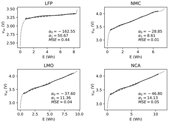 - Fowler, M.; DaCosta, A.; Mevawalla, A.; Panchal, S.; Fowler, M. Comparative Study of Equivalent Circuit Models Performance in Four Common Lithium-Ion Batteries: LFP, NMC, LMO, NCA. Batteries 2021, 7, 51. [Google Scholar] [CrossRef]