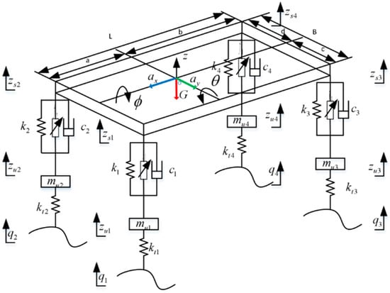 The seven-degrees-of-freedom whole-vehicle dynamics model is shown in Figure 1. The model is more consistent with the actual vehicle dynamics, so this paper chooses to use this model to develop the control algorithm [2]. It includes the body roll, body pitch, and body droop, as well as the droop movement of all four wheels. Where the subscripts n represent the left front wheel, right front wheel, left rear wheel, and right rear wheel, respectively; fn is the controlled damping force; z refers to the vertical displacement of the body centroid; θ represents the body pitch angle is the body roll angle; zsn is the vertical displacement of the body at the corresponding position; zun signifies the vertical displacement of the corresponding wheel; m is the upper spring mass; mun is the lower spring mass at each position; a, b, c, and d, respectively, denote the distance from the center of vehicle to the front, rear, left, and right ends; ktn is the stiffness of each tire; k1 and k2 are the stiffness of the front suspension elastic element; k3 and k4 refer to the stiffness of the rear suspension elastic element; cn is the passive suspension damping force; Iy is the pitch inertia, while Ix denotes the lateral tilt inertia; qn signifies the road input.