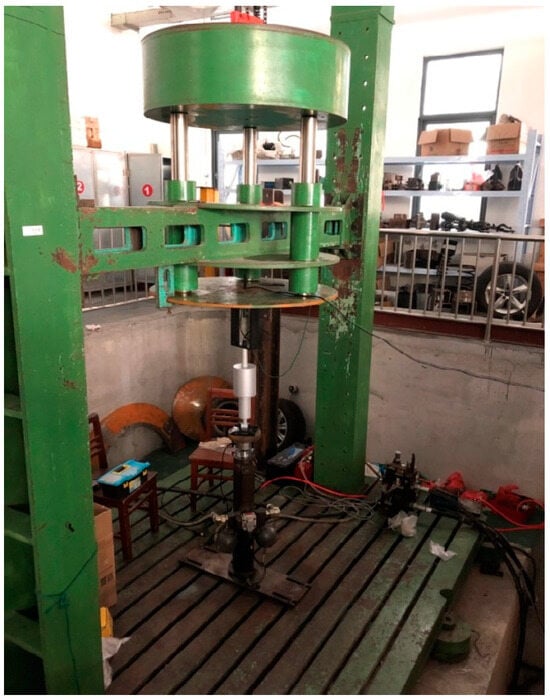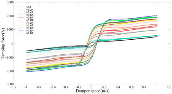 Characterization tests were conducted on a prototype magnetorheological damper. The arrangement of the test bench was referred to as the “Test Method of Cartridge Damper Bench QC/T395-1999”. The test rig included the upper computer, controller, excitation head, sensors, and other equipment. During the test, the magnetorheological damper was excited in the vertical direction to produce a simple harmonic motion with a fixed stroke in the middle of the test bench, and the test bench can be found in Figure 2. The supply current used in the test was varied in the range of 0–2 A at an interval of 0.2 A. After each current value was stabilized, cyclic loading was performed at different excitation frequencies. The average value of the recorded data was then taken as the test result to obtain the damper characteristics data under different currents. The results can be observed in Figure 3. It could be seen that, when the current was certain, the damping force was proportional to the speed of the magnetorheological damper. And, as the speed increased, the separation of the upper and lower branch curves of the magnetorheological damper demonstrated the characteristics of nonlinearity.