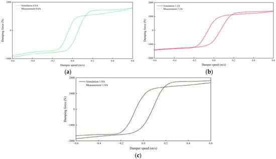 The maximum current 2 A has been specified in the text. From the figure, it can be seen that the magnitude of the damping force is proportional to the speed of the magnetorheological damper when the current is certain. And, with the increase of speed, the separation of the upper and lower branch curves of the magnetorheological damper is more obvious. The simulation and experimental comparison diagrams are shown in Figure 4.