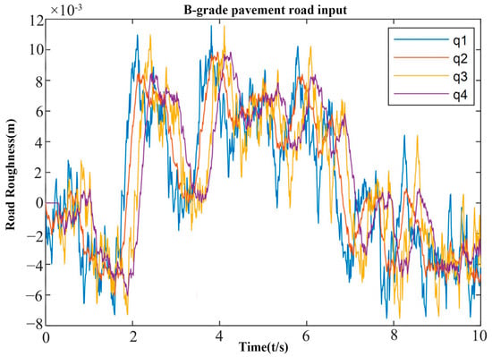 When the vehicle speed reached 10 m/s and the road surface was B-grade, the four-wheel pavement-unevenness input obtained from the simulation could be shown, as in Figure 5:
