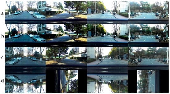 Then, the speed bump images were collected by real vehicles, and the photos of speed bumps with different shooting perspectives and different exposure degrees were selected to obtain effective data. To increase the sample size and improve the richness of the data, the dataset was expanded by the method of data augmentation. The images obtained are shown in Figure 6, in which a is the brightness enhancement, b signifies the contrast enhancement, c is the horizontal flip, and d is the random direction rotation. Finally, 4810 valid data were obtained, and the obtained image data were then target-labeled by the neural network dataset creation toolbox LabelImg to generate the VOC dataset, which produces a neural network readable dataset format.